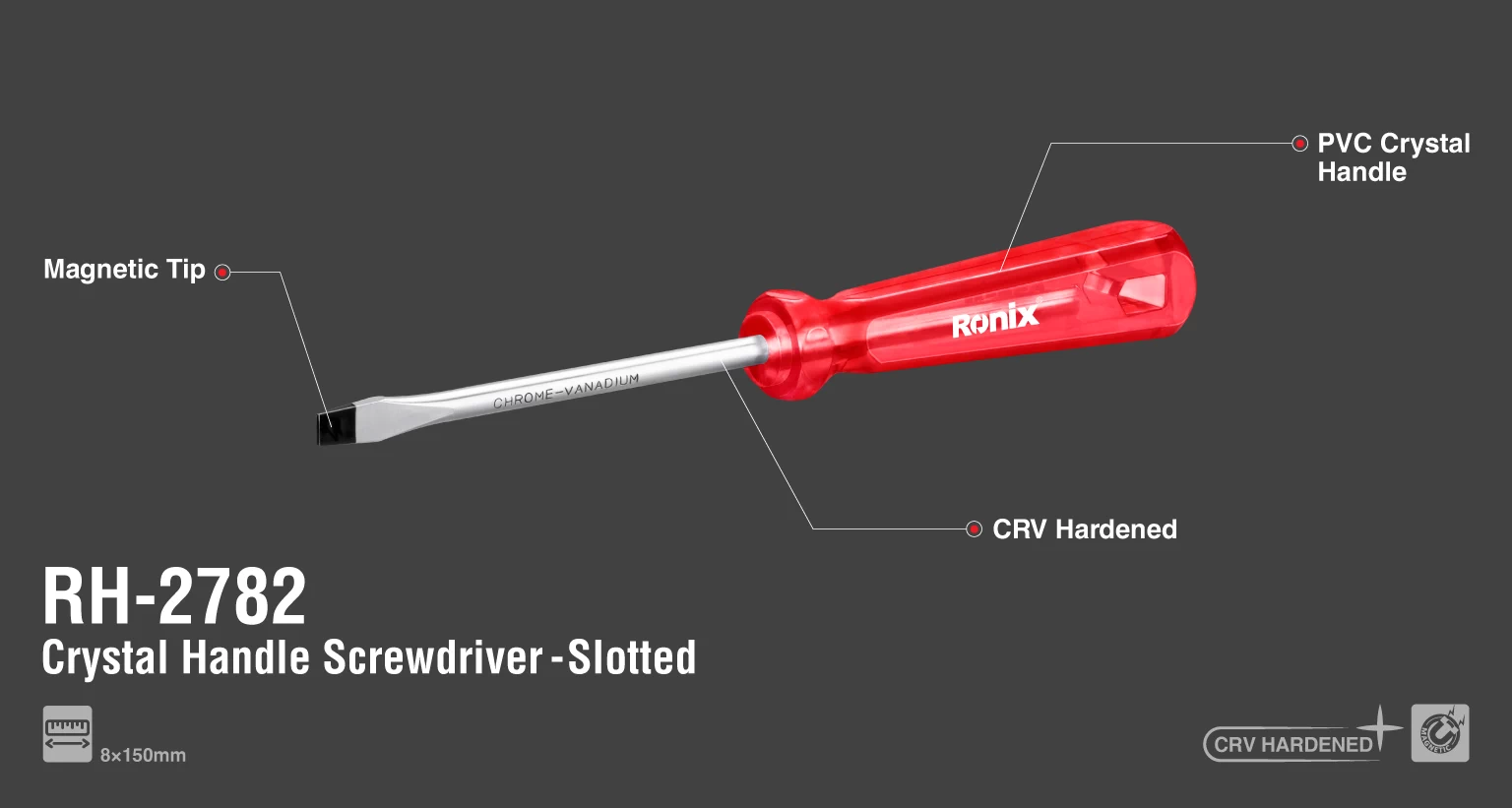 پیچ گوشتی ساده 150×8 دوسو دسته کریستالRH-2782رونیکس با طراحی ارگونومیک و کیفیت ساخت بالا ساخته شده است . لذت کار با این پیچ گوشتی پرکاربرد را از دست ندهید.